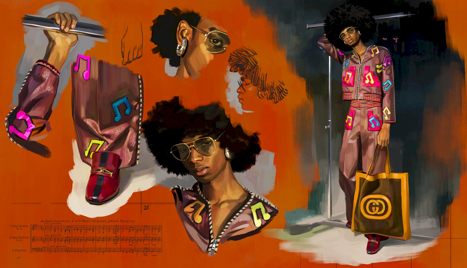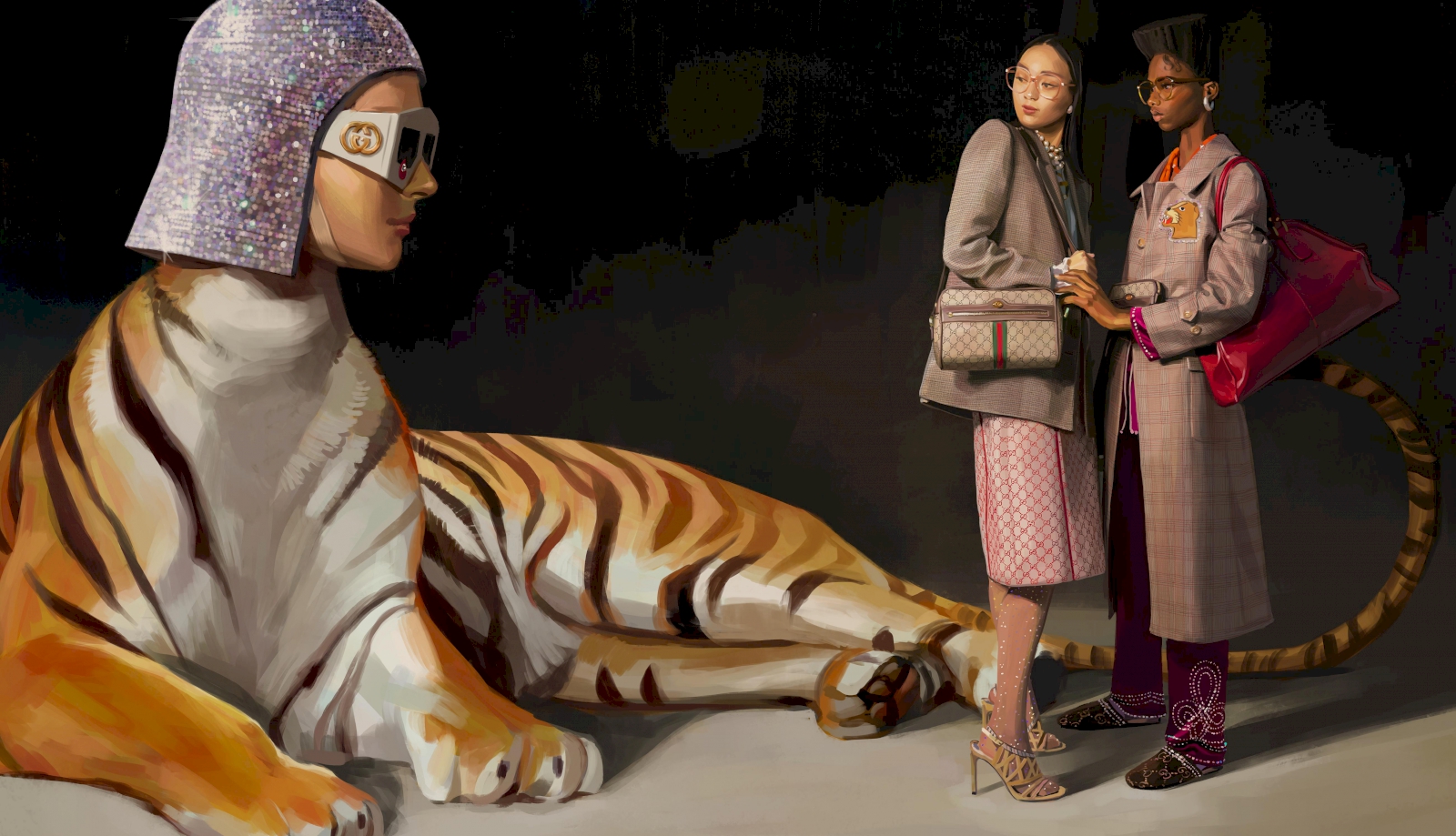 หรือหยิบเอาแรงบันดาลใจจากฉากหลังของภาพวาดอันประหลาดล้ำหลอนอย่าง The Garden of Earthly Delights (1490 - 1510) ของ เฮียโรนิมัช บอช (Hieronymus Bosch) และท่าโพสของคู่รักในภาพวาด Arnolfini Portrait (1434) ของ ยัน ฟัน ไอก์ (Jan van Eyck)ให้กลายเป็นท่าโพสของนายแบบและนางแบบในฉากหลังอันหลอนหลอก ที่นำเสนอสินค้าแฟชั่นอันเลิศหรูของกุชชี่ได้อย่างโดดเด่นเปี่ยมมนต์ขลัง ด้วยการผสมผสานเทคนิคงานจิตรกรรมเข้ากับศิลปะแบบดิจิตอลได้อย่างแนบเนียนไร้รอยต่อ