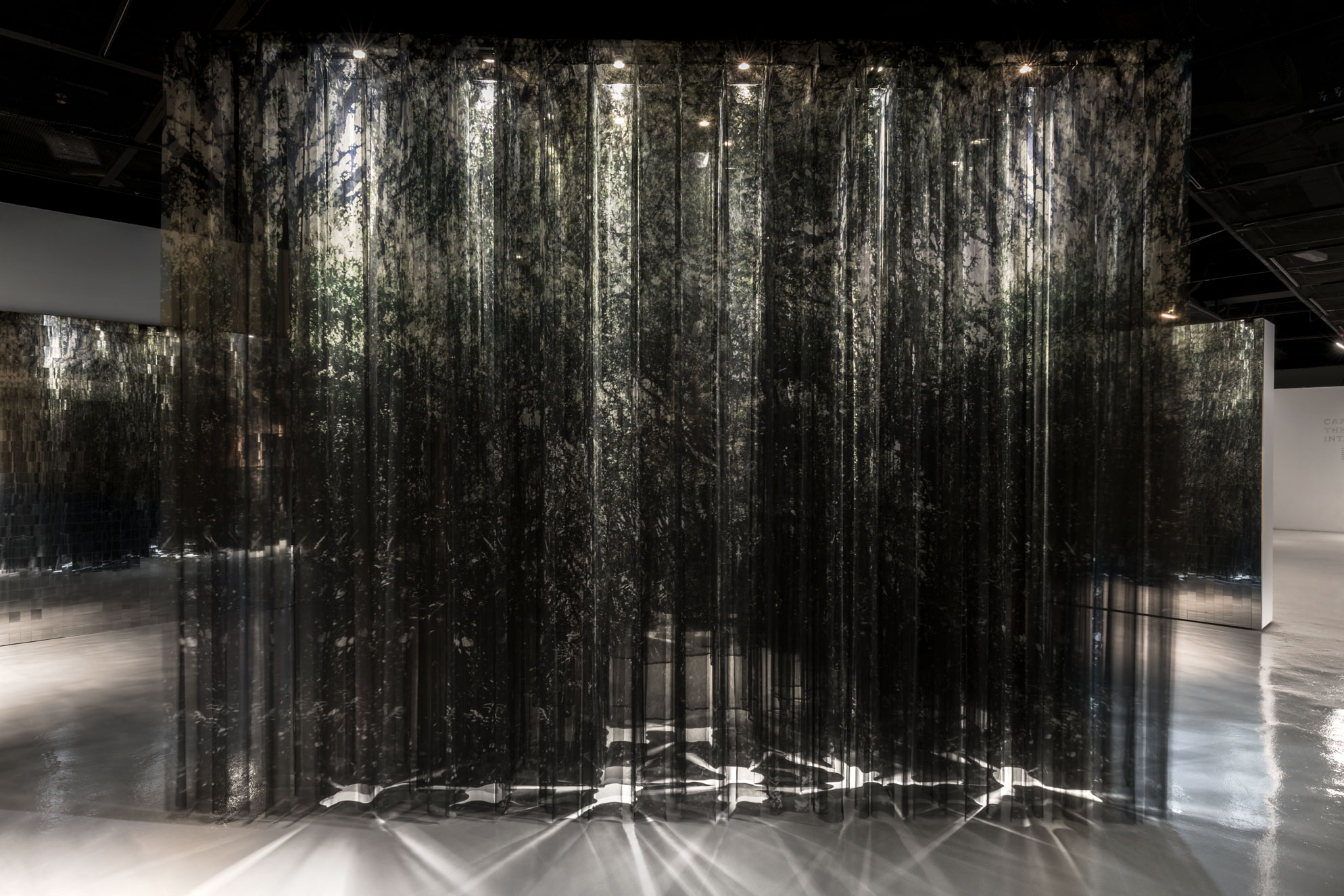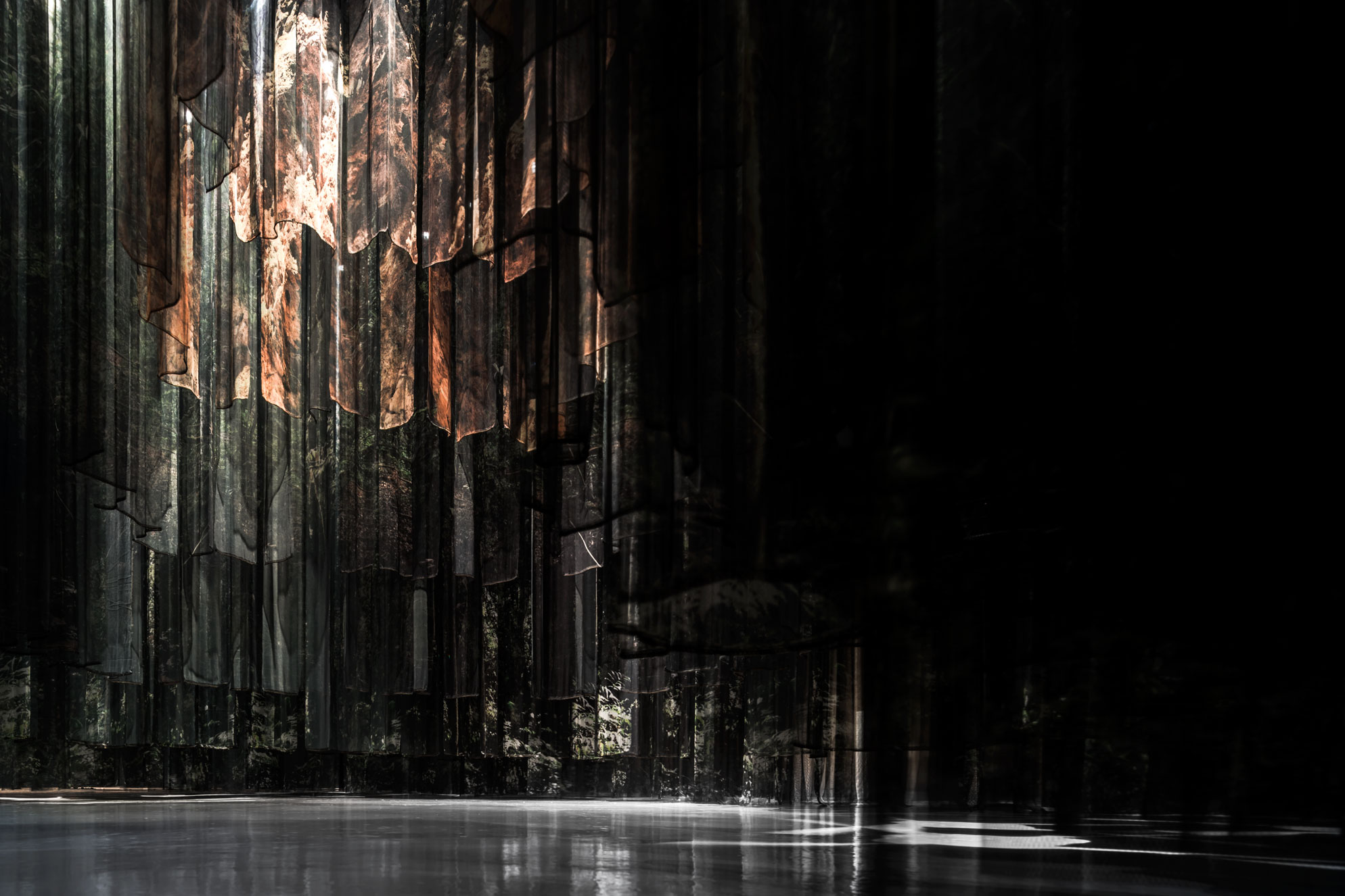 ใช่ค่ะ คือเราชอบอะไรที่มันเชื่อมโยงกับวัฒนธรรม ความเชื่อ อย่างเจดีย์ที่เราเห็น เราไหว้ เราเข้าไปเดินใกล้ๆ แต่เราไม่เคยเข้าไปข้างใน ไม่เคยรู้ว่าแก่นมันคืออะไร อันนี้ก็เลยเป็นที่มาของอีกชิ้นถัดมาที่ชื่อ A JOURNEY WITHIN ตัวงานมันจะเป็นผ้ามุ้งบางๆ พิมพ์รูปป่า ห้อยลงมาจากเพดาน โดยเปิดพื้นที่ให้แหวกให้คนได้เข้าไปสำรวจข้างใน ซึ่งพื้นที่ว่างข้างในมันเป็นรูปทรงนามธรรมของถ้ำ คล้ายๆ กับรูปกลับด้านของเจดีย์ คือทำพื้นที่ว่างให้เป็นรูปทรงเจดีย์ (ซึ่งมันก็เชื่อมโยงกับงาน เขามอ ด้วย) ซึ่งภาพป่าที่ว่าก็ถ่ายมาจากป่าที่บีนเคยไปมา คือเรามองว่า พอเราไปอยู่ในธรรมชาติ เราได้เห็นเรื่องการเปลี่ยนแปลง ซึ่งจริงๆ รูปทุกรูปที่อยู่ในเจดีย์ผ้ามันเป็นภาพป่าที่ไล่มาเรื่อยๆ จนมาถึงถ้ำที่อยู่ข้างใน จริงๆ ก็เหมือนกับพาคนกลับไปข้างนอกอีกครั้ง เพราะหอศิลป์จุฬามันเป็นพื้นที่ค่อนข้างปิดน่ะค่ะ ความตั้งใจแรกก็เลยอยากทำข้างในให้เป็นข้างนอก ก็เลยยกป่าเข้ามาอยู่ในหอศิลป์ และในอีกสเต็ปหนึ่งก็คือการพาคนกลับเข้าไปในพื้นที่ข้างในอีกที นั่นก็คือความเชื่อ