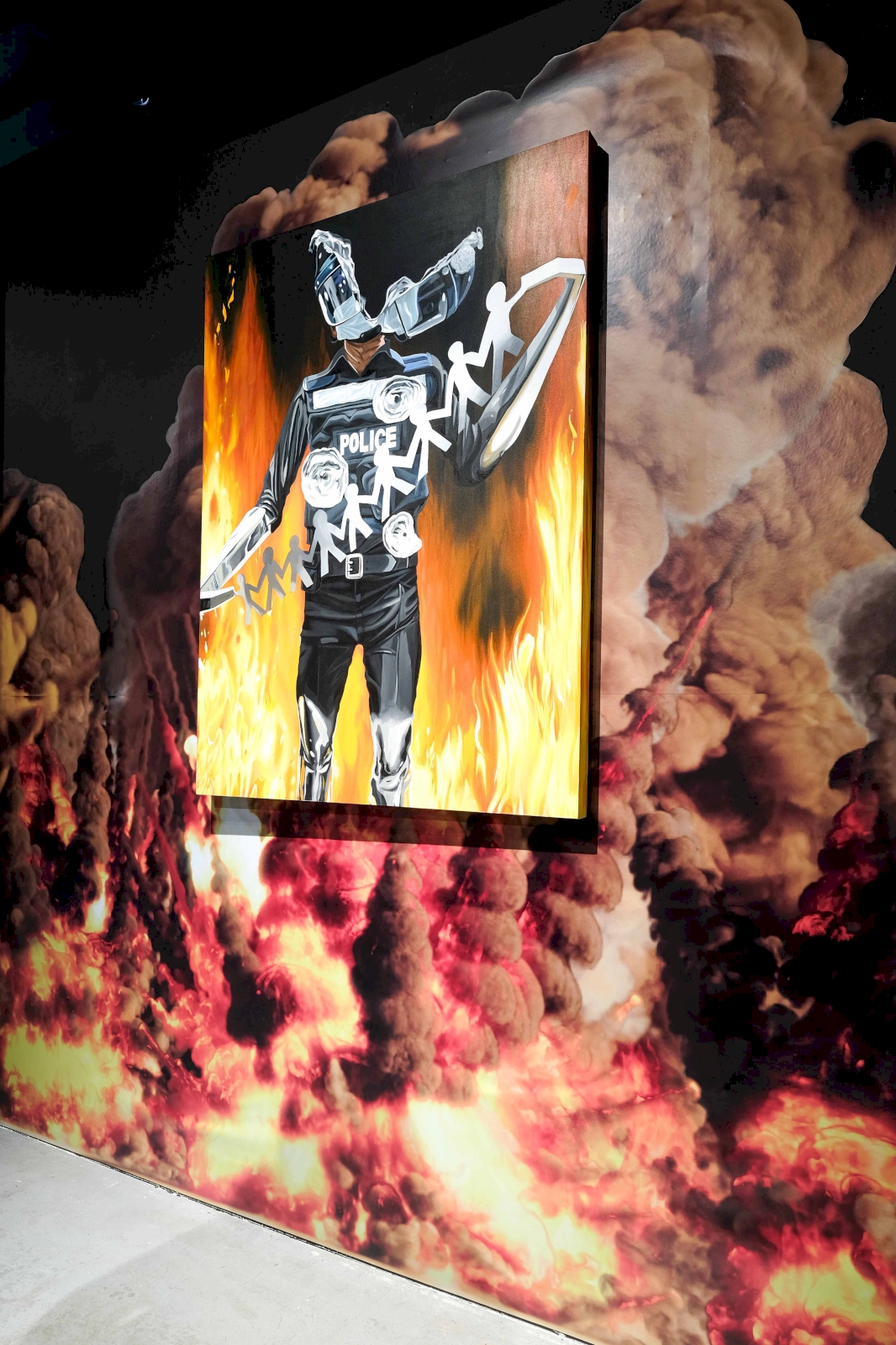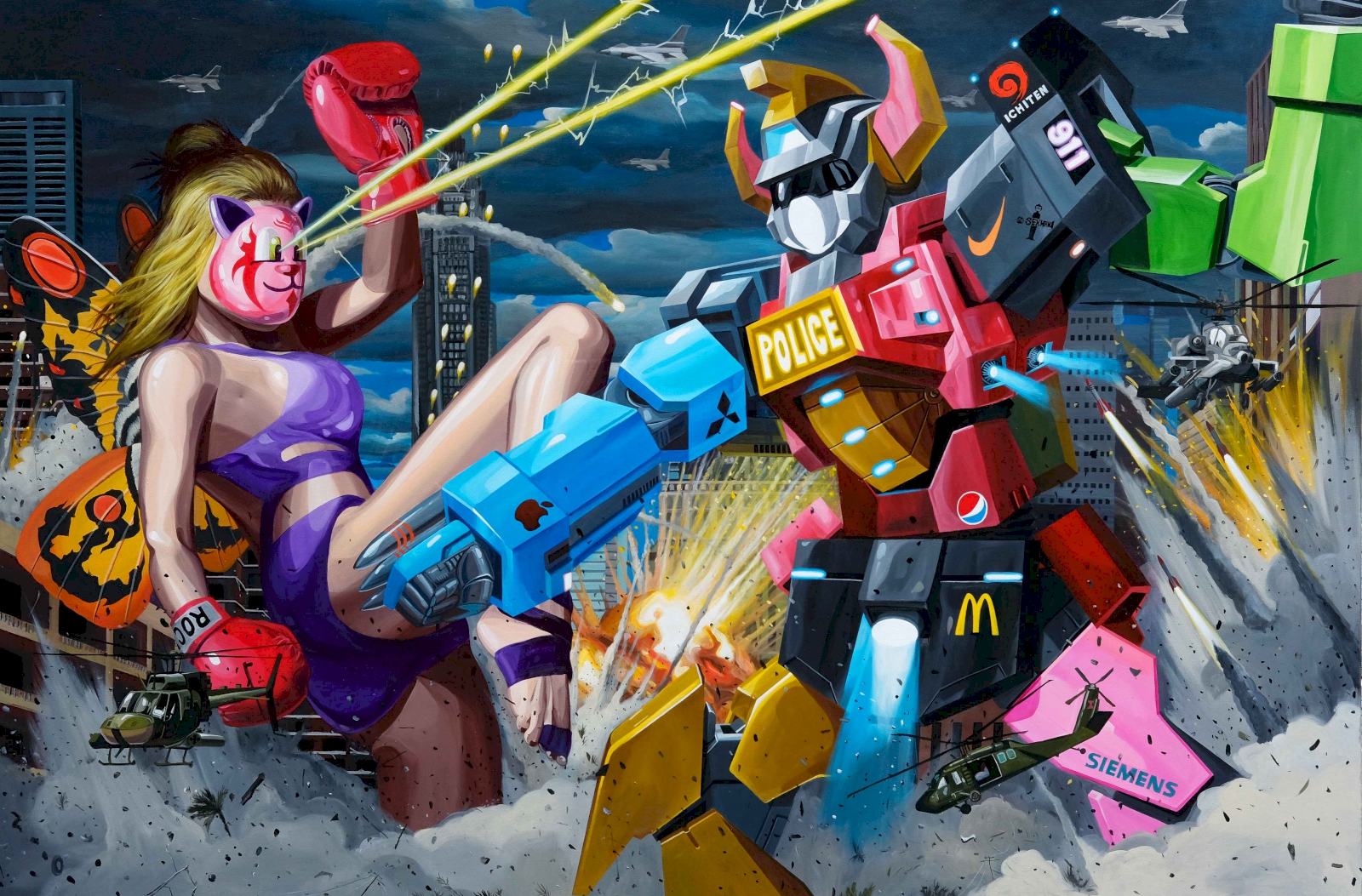 ใช่ๆ (หัวเราะ) ยิ่งวาดยิ่งออกมา ยิ่งชัด แต่ผมไม่เล่นกัมดั้มนะ เพราะผมไม่ดู ผมก็เลยไม่ค่อยอิน ที่ผมอินจริงๆ คือ ดราก้อนบอล, ขบวนการห้าสี ชอบมาก ผมเป็นติ่งมาร์เวลด้วย เพราะงานบางรูปในนิทรรศการนี้จะมีกลิ่นมาร์เวลอยู่ อย่างรูปใหญ่สุดในนิทรรศการนี้ชื่อ Civil War มันก็เป็นองค์ประกอบแบบมาร์เวลน่ะ คือมียอดมนุษย์สู้กันหลายๆ ตัวมาร่วมกันต่อสู้