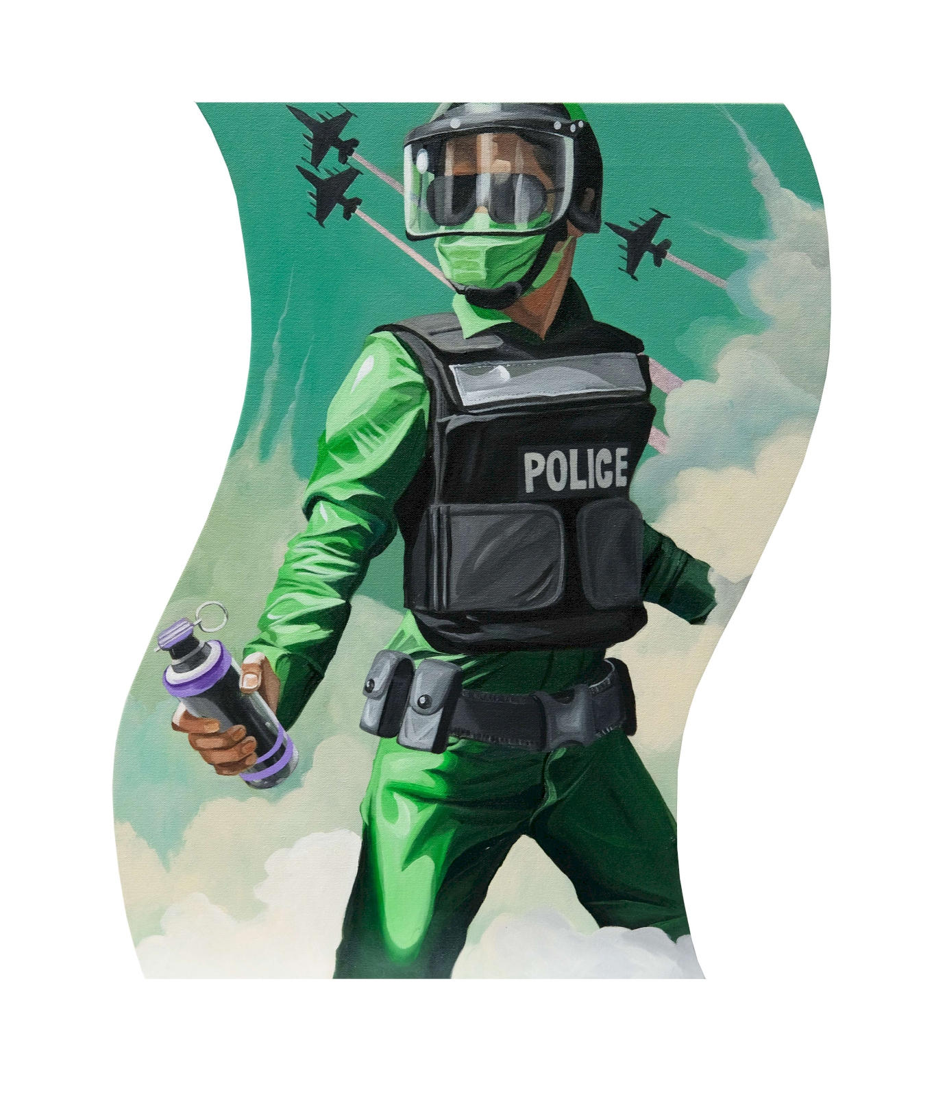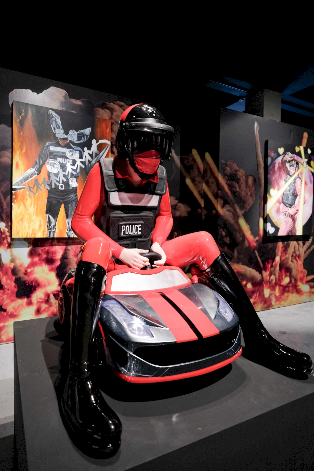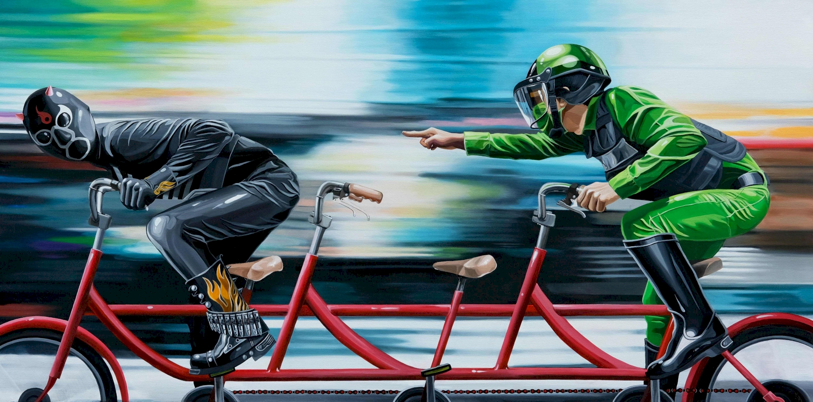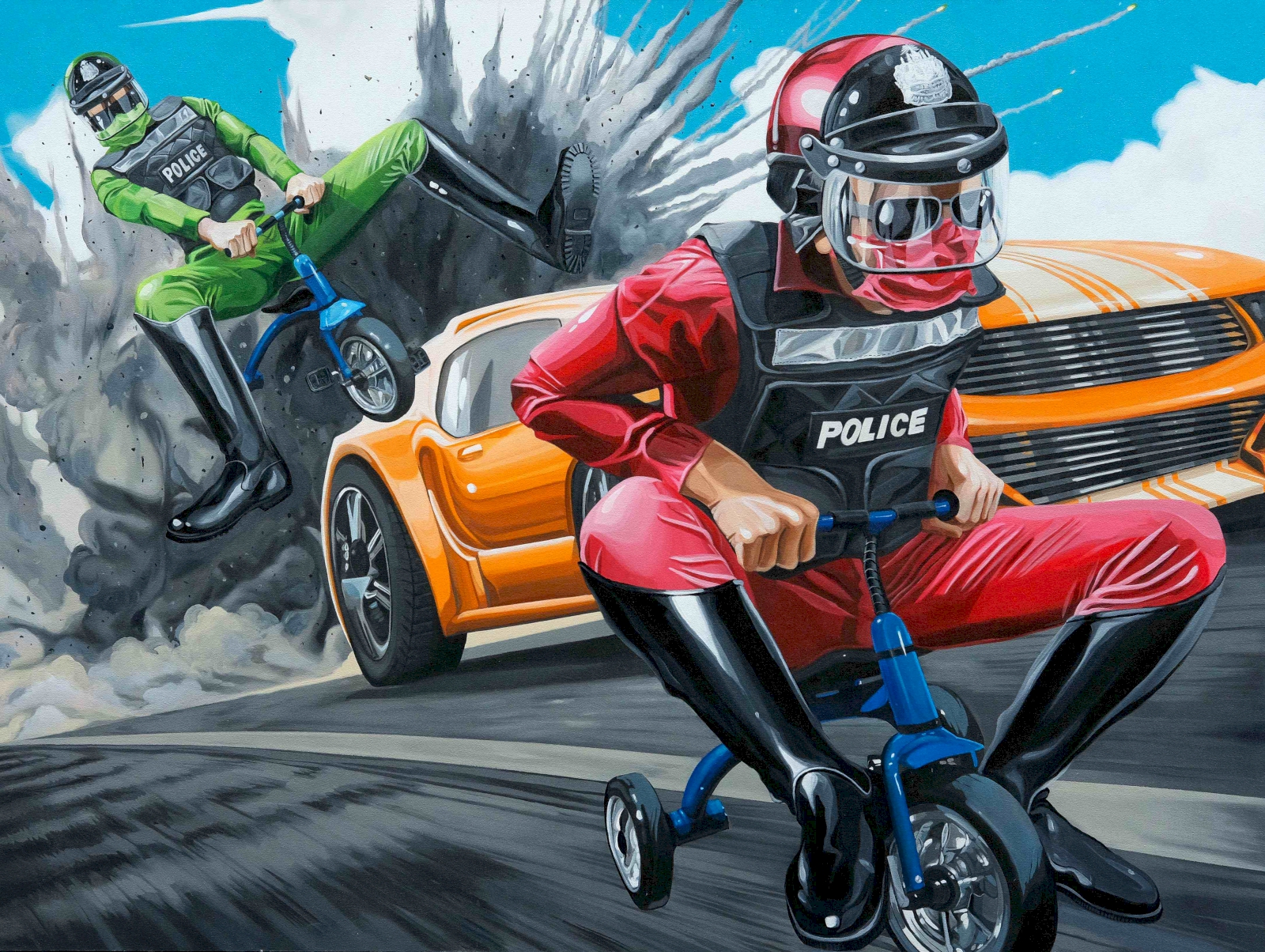ใช่ไง แค่แซวเล่น ภาพบางภาพ อารมณ์คือ เวลาเราเมาเหล้าแล้วขับรถกลับบ้าน แล้วเรากลัวว่า เลี้ยวขวาไปจะเจอด่านไหม พอเลี้ยวไปปุ๊บ จ๊ะเอ๋ สวัสดี เรามาแล้ว เราเอาอารมณ์อย่างงี้มาเขียนเป็นงาน แล้วก็วาดเป็นระเบิดตูมข้างหลัง แค่นั้นเอง เราไม่ได้ด่านะ แซวเฉยๆ ว่าเขามากันอีกแล้ว หรืออย่างภาพที่ไล่จับผู้ร้าย แต่ขี่จักรยานคันเดียวกัน อันนี้ก็ออกจะแฝงความดาร์กนิดนึง เพราะสุดท้ายเขาก็เป็นคนธรรมดาเหมือนกันกับเราๆ ซึ่งก็มีทั้งดีและไม่ดีใช่ป่ะ?