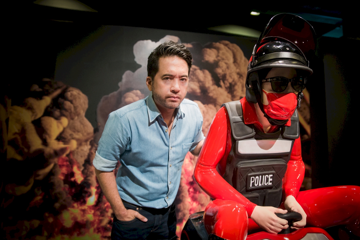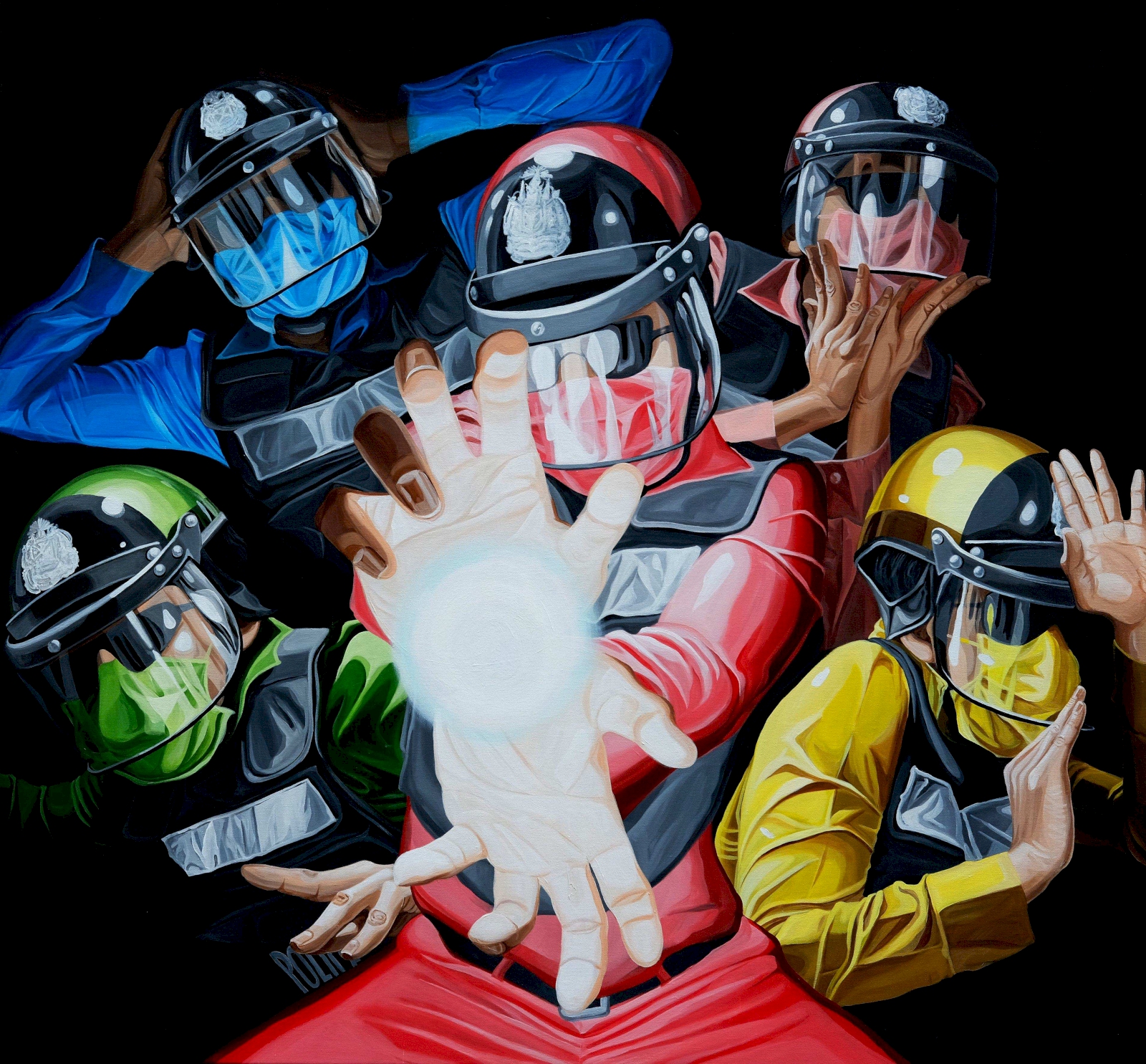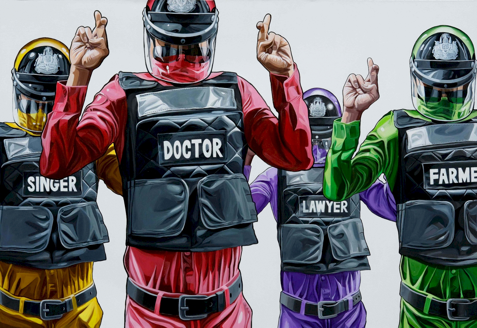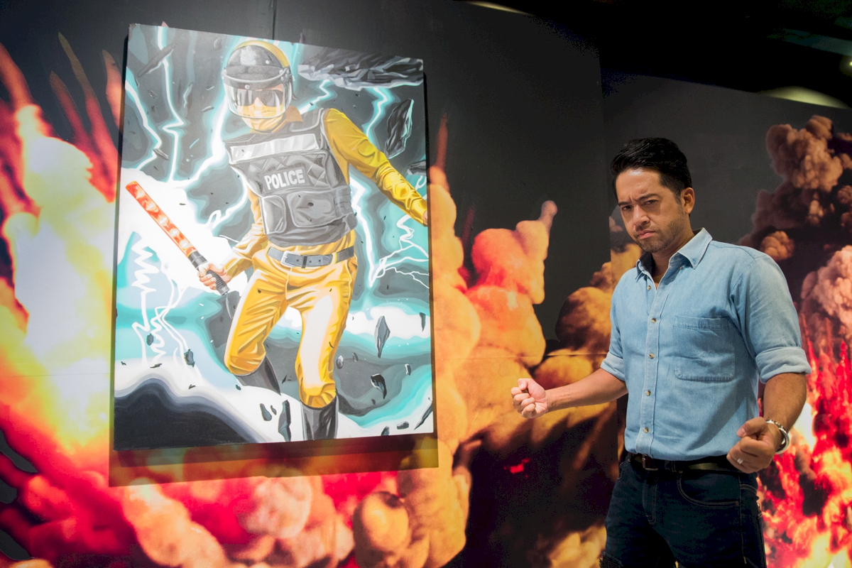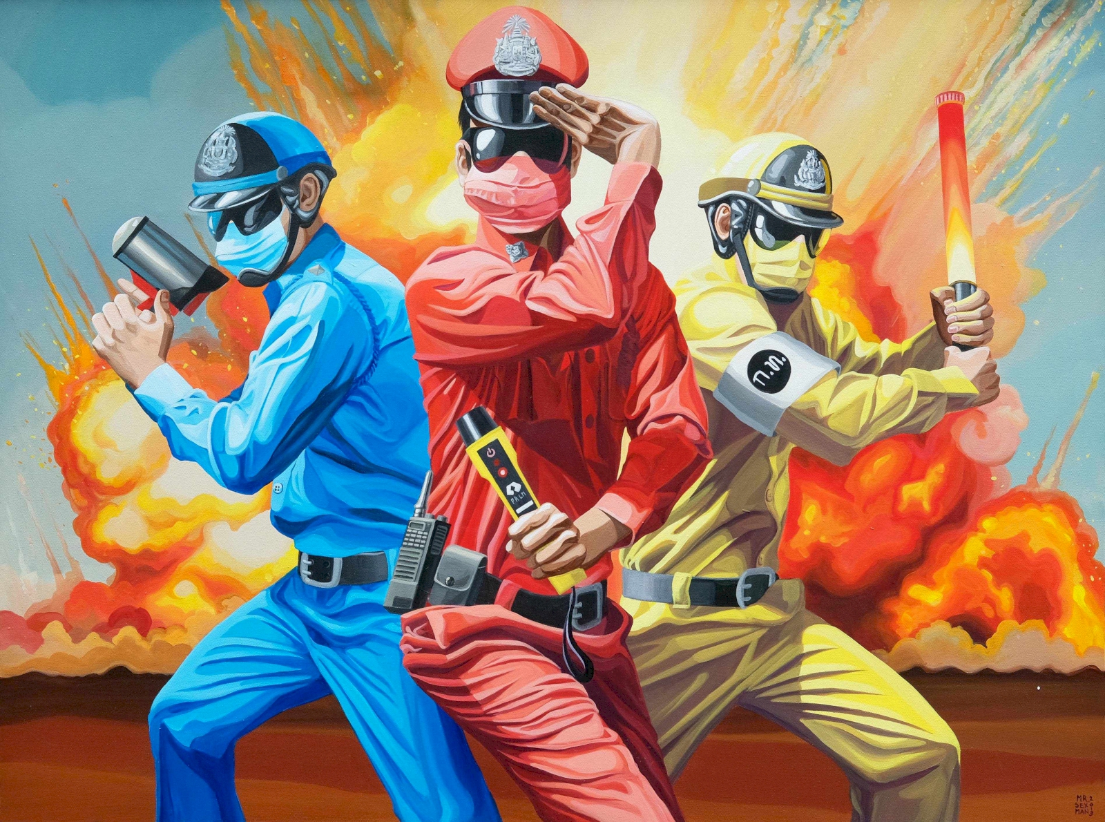 ด้วยความที่ผมไปอยู่ญี่ปุ่นมาตอนเด็กๆ งานผมก็จะเป็นสีเหมือนมังหงะ หรือการ์ตูนญี่ปุ่นมาโดยตลอด ผมชอบนักเขียนการ์ตูนคนนึงชื่อ อาจารย์โทริยามะ อากิระ (ผู้เขียนการ์ตูน Dragon Ball) เวลาเขาเขียนตัวเอง เขาจะใส่หน้ากากปิดปาก ผมก็เลยจิ๊กสัญลักษณ์เขามาใช้ เหมือนเป็นการคารวะอาจารย์เขาอีกทีนึง แล้วเราก็ชอบรูปแบบของยอดมนุษย์ พวกขบวนการยอดมนุษย์ 5 สี (Power Rangers) ภาษาญี่ปุ่นเขาเรียกว่า เซนไต ที่เป็นซีรีส์ฉายทางโทรทัศน์ที่ญี่ปุ่นตอนเย็นๆ แล้วเราก็คิดว่าตำรวจเนี่ย เป็นฮีโร่ที่คอยกอบกู้สถานการณ์ ปกป้องบ้านเมือง ผู้คน เราก็เลยทำงานชุดนี้ขึ้นมา โดยเอารูปแบบของยอดมนุษย์ Power Rangers มาใส่ให้ตำรวจ แต่ถ้าเอามาใช้ตรงๆ เดี๋ยวจะโดนลิขสิทธิ์ เราก็เลยเปลี่ยนเป็น Siam Rangers มันซะเลย ชุดของตัวละครก็คือชุดตำรวจนั่นแหละ แต่ทำหลากสีให้เหมือนกับชุด Power Rangers เท่านั้นเอง แล้วพอมันเป็นยอดมนุษย์แบบญี่ปุ่นมันก็ต้องมีการปล่อยพลังบ้าง ธีมของผมคือ มาแบบเว่อร์ๆ เล่นใหญ่ ถ้าใครเป็นคนรุ่นเราจะรู้ว่าเราเล่นมุกอะไร เพราะมันอยู่ในการ์ตูน อย่างภาพที่ต่อยรัวๆ ก็เอามาจากเคนชิโร่ หมัดเทพเจ้าดาวเหนือ หรือรูปที่ยิงปืนฉีดน้ำก็เอามาจากหนัง จอห์น วู หรือหุ่นยนต์ T-1000 ในหนัง Terminator 2: Judgment Day (1991) ก็เป็นมุกในวัฒนธรรมป๊อป แต่เป็นป๊อปในยุคของผมนะ