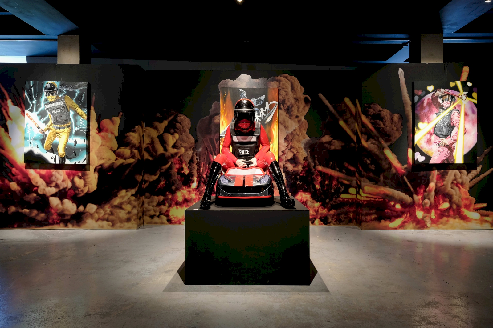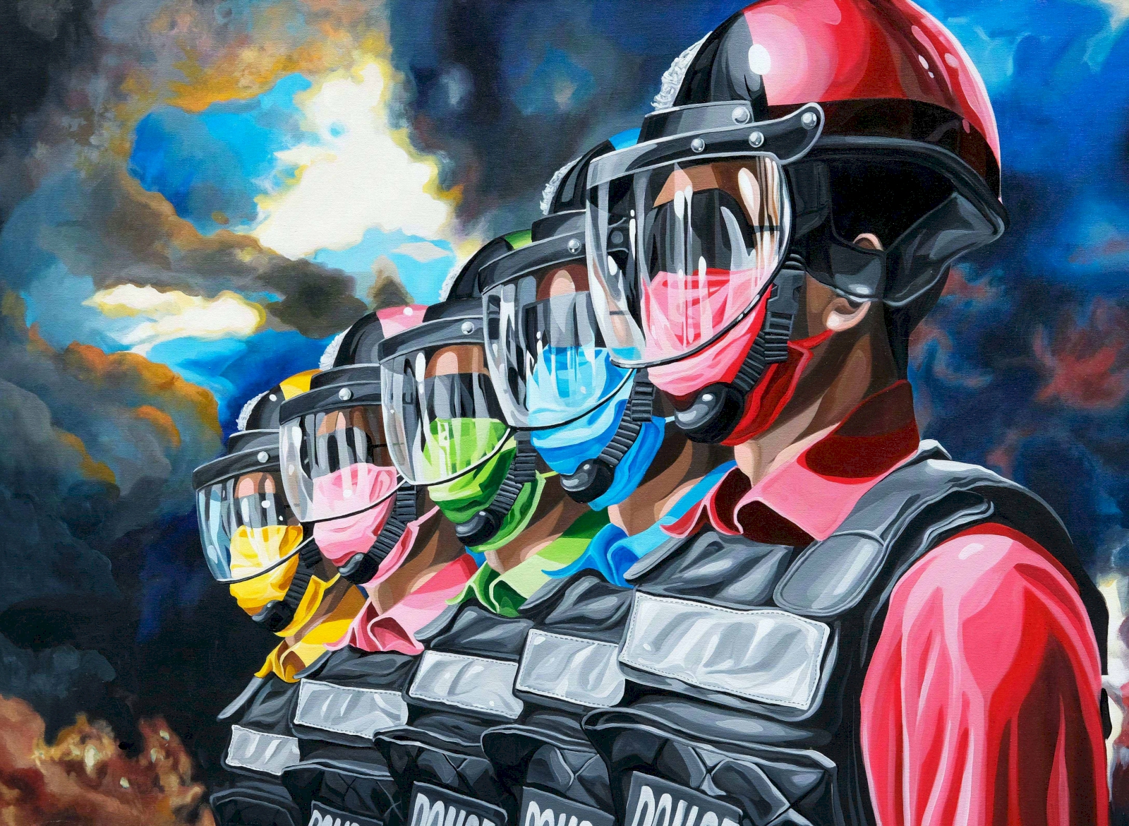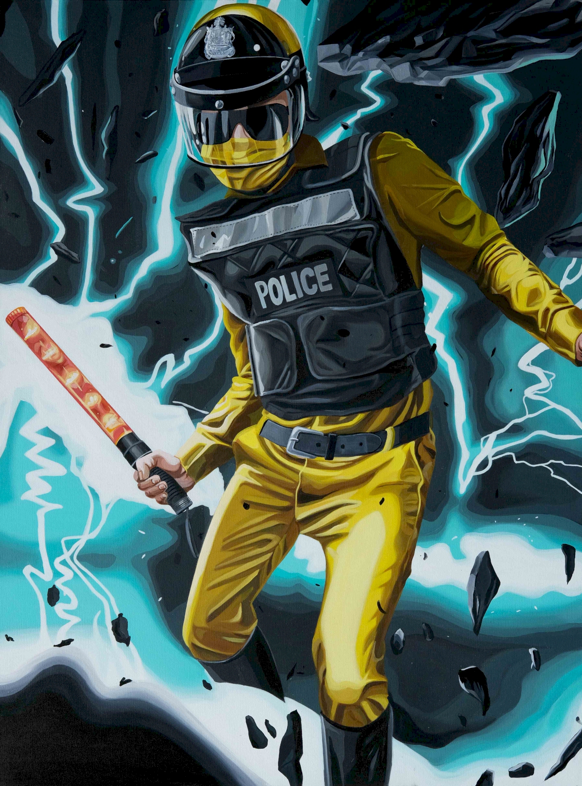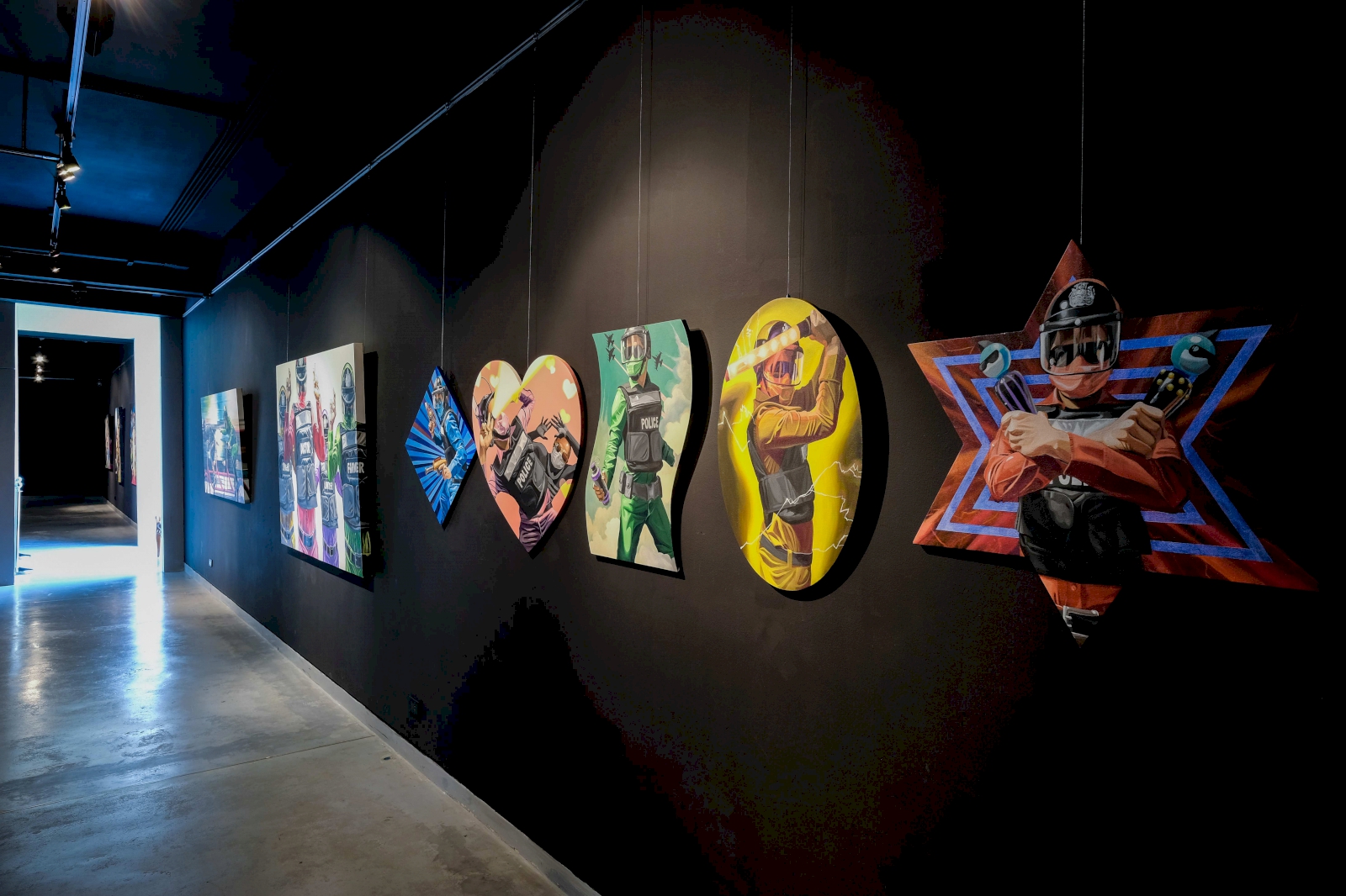 ด้วยความที่ผมไปอยู่ญี่ปุ่นมาตอนเด็กๆ งานผมก็จะเป็นสีเหมือนมังหงะ หรือการ์ตูนญี่ปุ่นมาโดยตลอด ผมชอบนักเขียนการ์ตูนคนนึงชื่อ อาจารย์โทริยามะ อากิระ (ผู้เขียนการ์ตูน Dragon Ball) เวลาเขาเขียนตัวเอง เขาจะใส่หน้ากากปิดปาก ผมก็เลยจิ๊กสัญลักษณ์เขามาใช้ เหมือนเป็นการคารวะอาจารย์เขาอีกทีนึง แล้วเราก็ชอบรูปแบบของยอดมนุษย์ พวกขบวนการยอดมนุษย์ 5 สี (Power Rangers) ภาษาญี่ปุ่นเขาเรียกว่า เซนไต ที่เป็นซีรีส์ฉายทางโทรทัศน์ที่ญี่ปุ่นตอนเย็นๆ แล้วเราก็คิดว่าตำรวจเนี่ย เป็นฮีโร่ที่คอยกอบกู้สถานการณ์ ปกป้องบ้านเมือง ผู้คน เราก็เลยทำงานชุดนี้ขึ้นมา โดยเอารูปแบบของยอดมนุษย์ Power Rangers มาใส่ให้ตำรวจ แต่ถ้าเอามาใช้ตรงๆ เดี๋ยวจะโดนลิขสิทธิ์ เราก็เลยเปลี่ยนเป็น Siam Rangers มันซะเลย ชุดของตัวละครก็คือชุดตำรวจนั่นแหละ แต่ทำหลากสีให้เหมือนกับชุด Power Rangers เท่านั้นเอง แล้วพอมันเป็นยอดมนุษย์แบบญี่ปุ่นมันก็ต้องมีการปล่อยพลังบ้าง ธีมของผมคือ มาแบบเว่อร์ๆ เล่นใหญ่ ถ้าใครเป็นคนรุ่นเราจะรู้ว่าเราเล่นมุกอะไร เพราะมันอยู่ในการ์ตูน อย่างภาพที่ต่อยรัวๆ ก็เอามาจากเคนชิโร่ หมัดเทพเจ้าดาวเหนือ หรือรูปที่ยิงปืนฉีดน้ำก็เอามาจากหนัง จอห์น วู หรือหุ่นยนต์ T-1000 ในหนัง Terminator 2: Judgment Day (1991) ก็เป็นมุกในวัฒนธรรมป๊อป แต่เป็นป๊อปในยุคของผมนะ