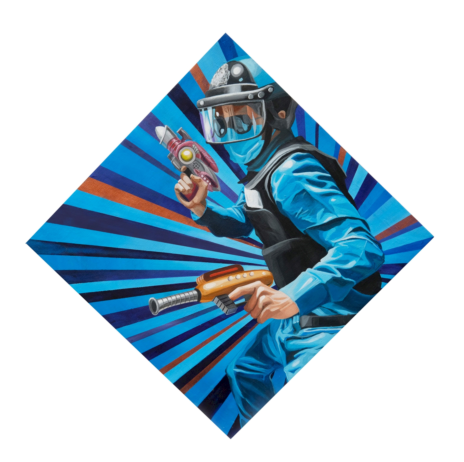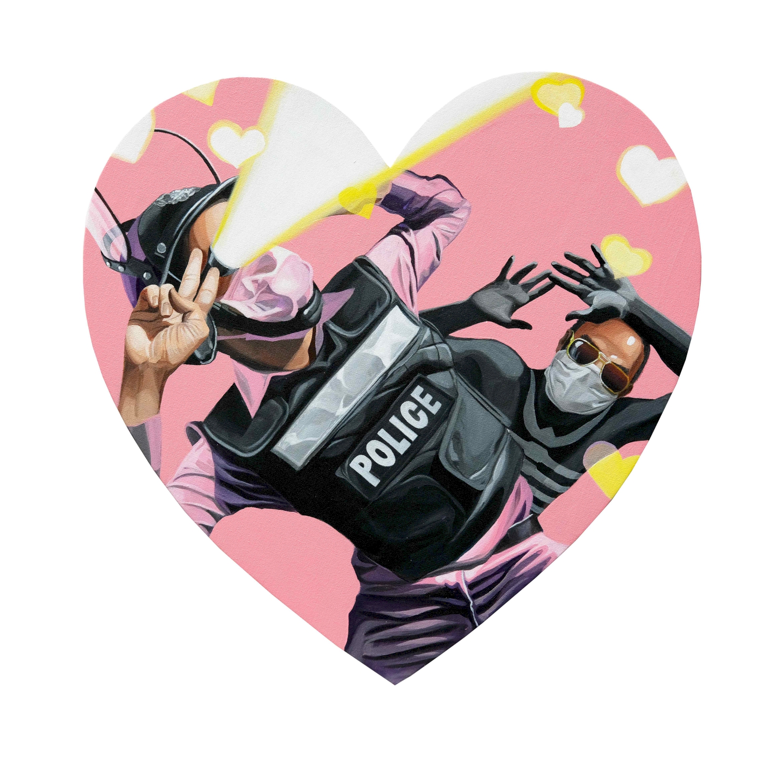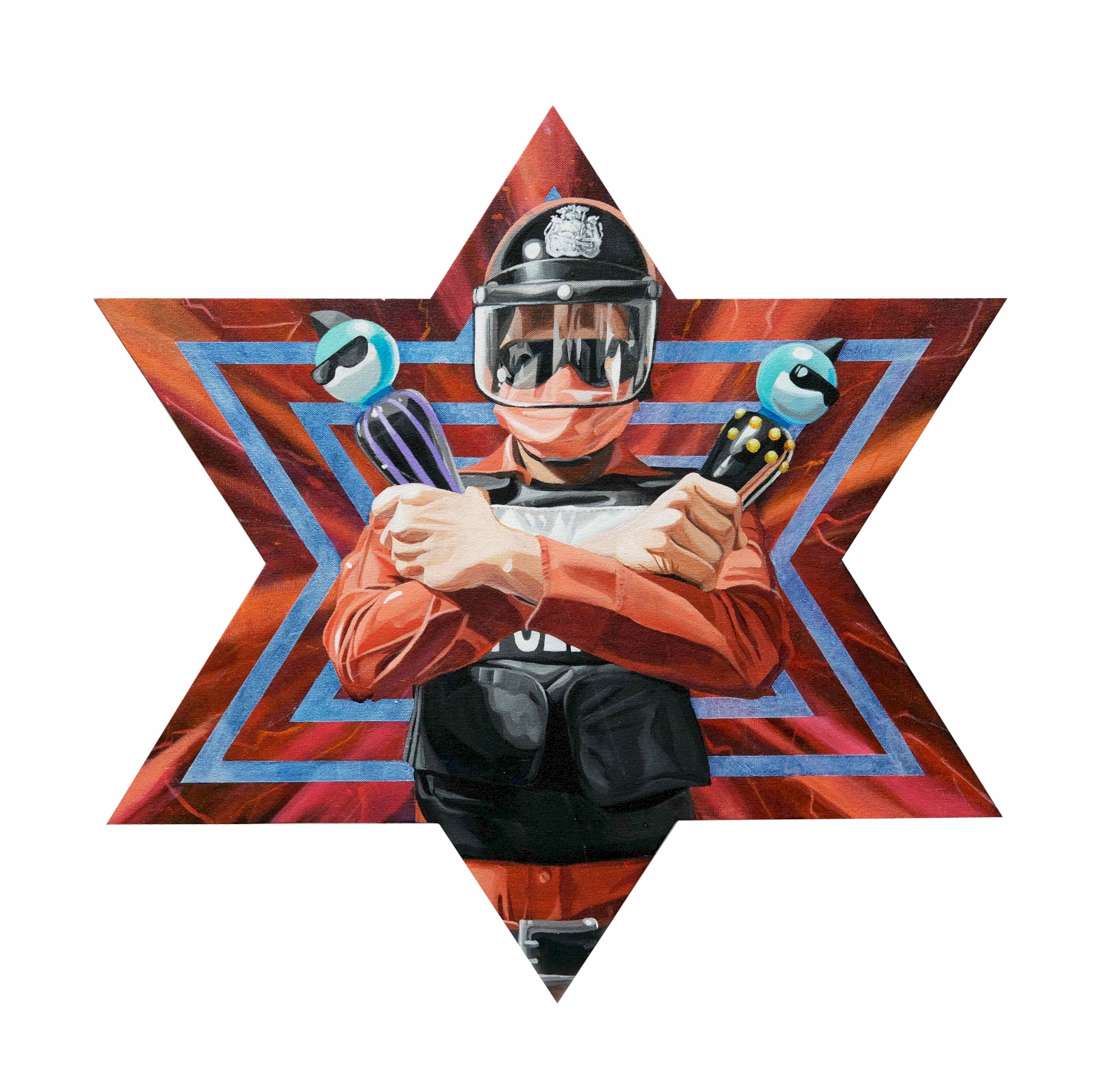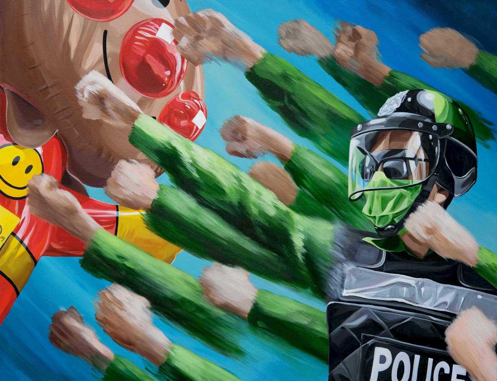 ด้วยความที่ผมไปอยู่ญี่ปุ่นมาตอนเด็กๆ งานผมก็จะเป็นสีเหมือนมังหงะ หรือการ์ตูนญี่ปุ่นมาโดยตลอด ผมชอบนักเขียนการ์ตูนคนนึงชื่อ อาจารย์โทริยามะ อากิระ (ผู้เขียนการ์ตูน Dragon Ball) เวลาเขาเขียนตัวเอง เขาจะใส่หน้ากากปิดปาก ผมก็เลยจิ๊กสัญลักษณ์เขามาใช้ เหมือนเป็นการคารวะอาจารย์เขาอีกทีนึง แล้วเราก็ชอบรูปแบบของยอดมนุษย์ พวกขบวนการยอดมนุษย์ 5 สี (Power Rangers) ภาษาญี่ปุ่นเขาเรียกว่า เซนไต ที่เป็นซีรีส์ฉายทางโทรทัศน์ที่ญี่ปุ่นตอนเย็นๆ แล้วเราก็คิดว่าตำรวจเนี่ย เป็นฮีโร่ที่คอยกอบกู้สถานการณ์ ปกป้องบ้านเมือง ผู้คน เราก็เลยทำงานชุดนี้ขึ้นมา โดยเอารูปแบบของยอดมนุษย์ Power Rangers มาใส่ให้ตำรวจ แต่ถ้าเอามาใช้ตรงๆ เดี๋ยวจะโดนลิขสิทธิ์ เราก็เลยเปลี่ยนเป็น Siam Rangers มันซะเลย ชุดของตัวละครก็คือชุดตำรวจนั่นแหละ แต่ทำหลากสีให้เหมือนกับชุด Power Rangers เท่านั้นเอง แล้วพอมันเป็นยอดมนุษย์แบบญี่ปุ่นมันก็ต้องมีการปล่อยพลังบ้าง ธีมของผมคือ มาแบบเว่อร์ๆ เล่นใหญ่ ถ้าใครเป็นคนรุ่นเราจะรู้ว่าเราเล่นมุกอะไร เพราะมันอยู่ในการ์ตูน อย่างภาพที่ต่อยรัวๆ ก็เอามาจากเคนชิโร่ หมัดเทพเจ้าดาวเหนือ หรือรูปที่ยิงปืนฉีดน้ำก็เอามาจากหนัง จอห์น วู หรือหุ่นยนต์ T-1000 ในหนัง Terminator 2: Judgment Day (1991) ก็เป็นมุกในวัฒนธรรมป๊อป แต่เป็นป๊อปในยุคของผมนะ