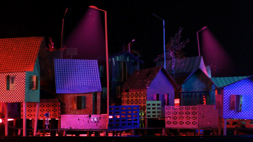 ใช่ครับ แล้วก็ไม่ได้วาดด้วย ทำของเล็กๆ อย่างการตัดกระดาษเป็นเซ็ตดีไซน์ชิ้นเล็กๆ แล้วก็ค่อยๆ ถ่ายเป็นสต็อปโมชั่น แต่ไม่ได้ทำแล้วนะครับ ไม่ไหว เหนื่อย (หัวเราะ) คือผมเป็นคนชอบอะไรบ้านๆ ชอบอะไรประหลาดๆ ตอนนั้นเดินซอยนานาแล้วมันจะมีพวกงานศิลปะบ้านๆ แบบพวกรูปช้าง กระท่อมปลายนา มีต้นมะพร้าว เราเรียนมันว่า Neon Art หรือ Tourist Art ที่ขายนักท่องเที่ยวน่ะ ที่คนจะชอบมองว่ามันเห่ย เราก็เลยรู้สึกท้าทายว่า มันไม่เห่ยน่ะ ก็เลยหยิบเอาพวกนั้นมาทำเป็นเซ็ตดีไซน์ทำเป็นแอนิเมชั่นออกมา
