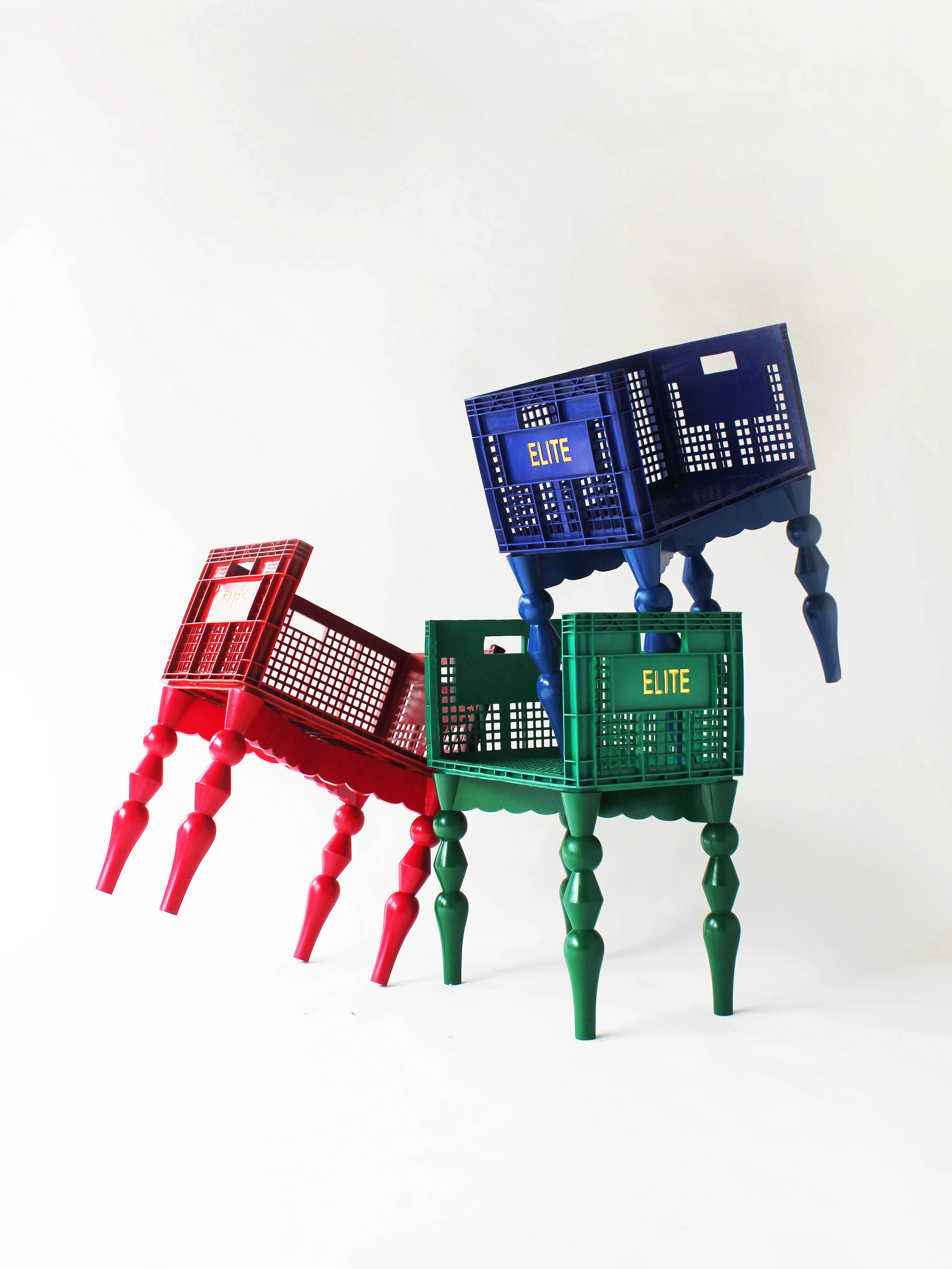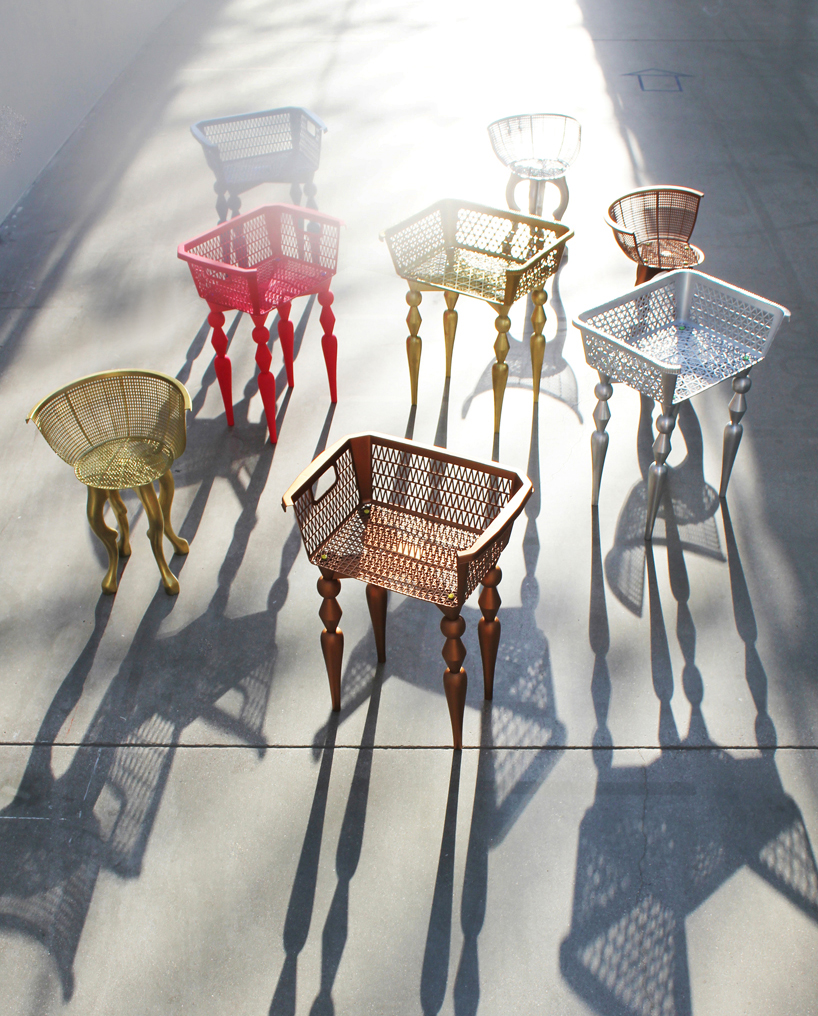 ตะกร้าเลยครับ เอามาเฉือนเลย ไม่ได้หล่อขึ้นมาใหม่ ไม่มี๊ (หัวเราะลั่น) ดิบมาก! แล้วเวลาทำสีทำยังไง ก็พ่นสีสเปรย์ทับพลาสติกไปเลย เหมือนงานพร็อพ (หัวเราะ) แต่หลังๆ เราเริ่มเรียนรู้แล้วว่าการพ่นสีพลาสติกมันไม่ใช่วิธีการที่ถูกต้อง สีมันหลุดครับ (หัวเราะ) เลยใช้วิธีหาตะกร้าที่มีสีที่เราต้องการและทำสีขาให้ตรงกับตะกร้าเอา ดิบกว่า! (หัวเราะร่วน) ตอนหลังตะกร้านี่รู้แหล่งผลิตเลยครับ แล้วเวลาปั๊มตัวหนังสือข้างๆ นี่เราก็สั่งได้เลยว่าเราจะเอาคำว่าอะไร แบบ "เจ๊เข่ง" อะไรแบบนี้ หลังๆ นี่เริ่มหาตะกร้าที่ใช้จริงๆ มาแล้วด้วย แล้วก็ให้ช่างไม้ทำขาแต่ละตัวให้ไม่เหมือนกัน แต่ตอนนี้ช่างตายไปแล้ว คือเสียชีวิต เลยทำต่อไม่ได้ ก็ต้องหาผู้ผลิตใหม่อีก