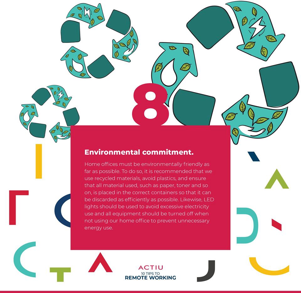 โฮมออฟฟิศควรเป็นมิตรต่อสิ่งแวดล้อมมากเท่าที่จะเป็นไปได้ ด้วยการใช้วัสดุที่สามารถรีไซเคิล หลีกเลี่ยงการใช้พลาสติกเท่าที่จำเป็น และใส่ใจในการแยกทิ้งขยะให้ถูกประเภท เพื่อให้นำกลับมารีไซเคิลได้อย่างเปี่ยมประสิทธิภาพที่สุด หลอดไฟควรเลือกใช้แบบ LED เพื่อประหยัดพลังงาน และควรปิดอุปกรณ์และเครื่องใช้ไฟฟ้าทุกครั้งที่เลิกใช้งาน เพื่อลดการใช้พลังงานสิ้นเปลืองโดยไม่จำเป็น