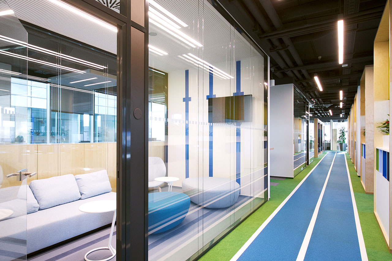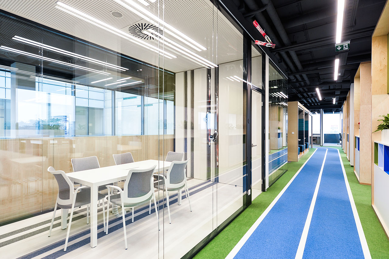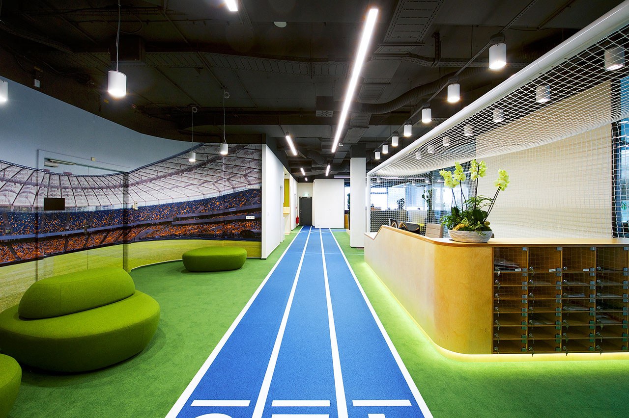 ด้วยเก้าอี้ Badminton หนึ่งคู่ ที่วางต้อนรับผู้มาเยือนที่ล็อบบี้ ที่มีลักษณะเช่นเดียวกับโถงทางเดินในพื้นที่ทำงานแห่งนี้ ด้วยการตกแต่งที่เลียนแบบลู่วิ่งของนักกีฬา โดยใช้สีเขียวและน้ำเงินซึ่งเป็นสีที่กระตุ้นพลังและเป็นสีขององค์กร ที่ครอบครองพื้นที่ตรงกลางของสำนักงาน และนำพาเหล่าบรรดาคนทำงานและผู้มาเยี่ยมเยือนให้โลดแล่นไปยังทั่วทุกพื้นที่ในบริษัท