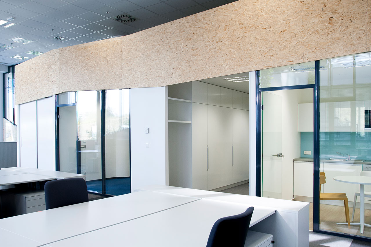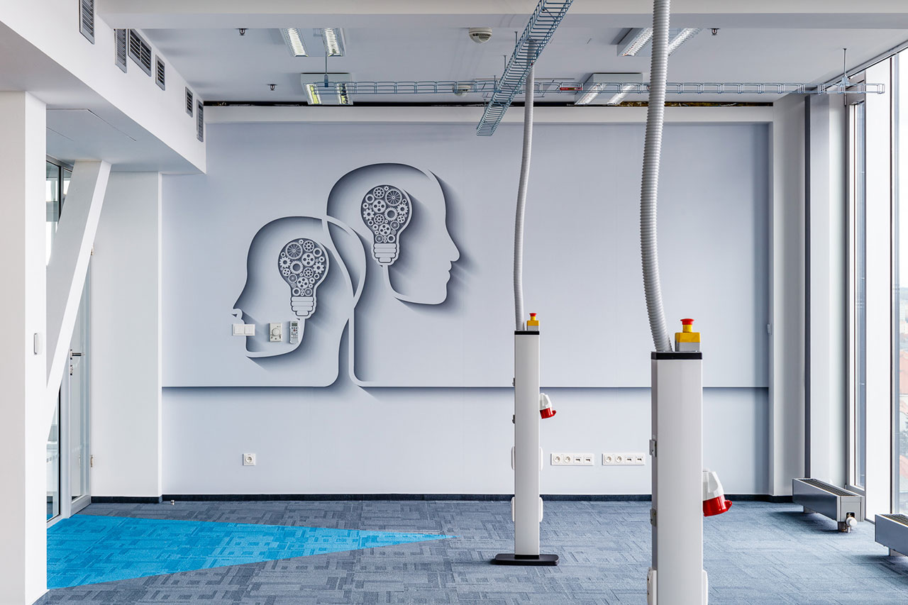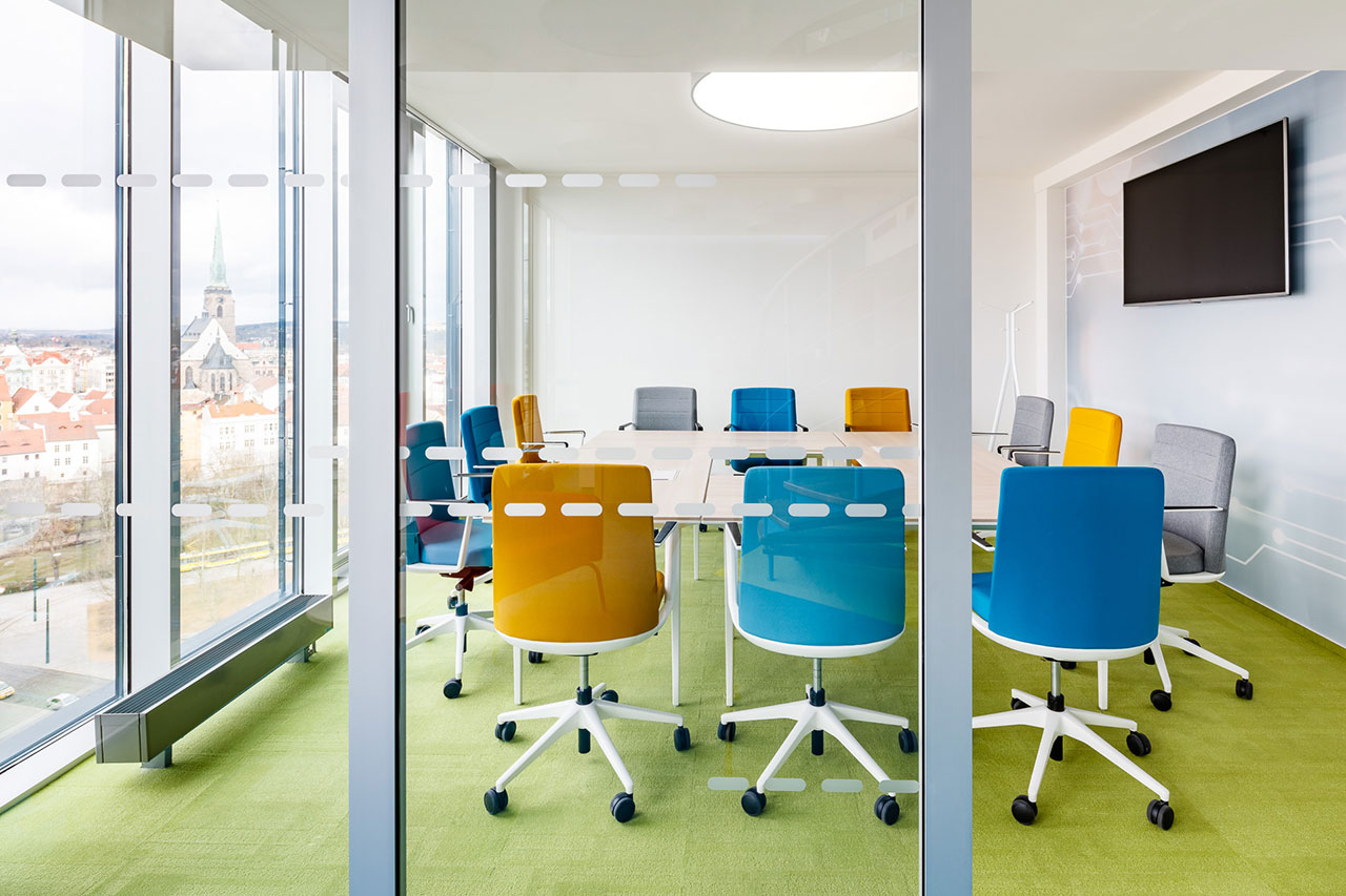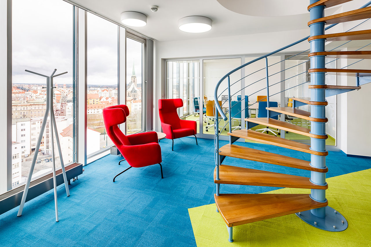 ในการตกแต่งสำนักงานของ SIEMENS ในเมือง เปิลเซน ในแคว้นโบฮีเมีย ผู้ออกแบบ ตกแต่งสำนักงานใหม่ด้วยการใช้หน้าต่างกระจกที่เปิดให้แสงภายนอกสาดส่องเข้ามาในพื้นที่ทำงาน และเปิดให้เห็นวิวตระการตาาภายนอก และสร้างบรรยากาศภายในด้วยสีขององค์กรในเฟอร์นิเจอร์และพรมที่ตัดกันกับสีของแสงเงาของผนังและฝ้าเพดาน