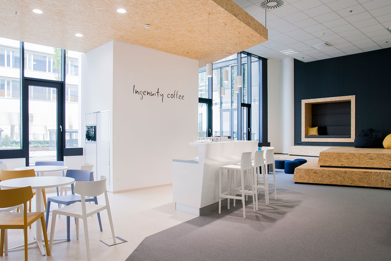 ซึ่งเก้าอี้ CRON และโต๊ะ LONGO ถูกตกแต่งและใช้งานในห้องประชุม รวมถึงห้องพักดื่มกาแฟ ในขณะที่ ห้องคาเฟ่และพื้นที่รับประทานอาหารกลางวัน ที่ตกแต่งและใช้งานด้วย เก้าอี้ WING และโต๊ะ TABULAR ที่เลือกมาใช้งานเพื่อเป็นเครื่องประดับทางสายตา และใช้งานได้อย่างเปี่ยมประสิทธิภาพ ในพื้นที่ส่วนกลาง ซึ่งยังสามารถปรับเปลี่ยนให้กลายเป็นห้องประชุมขนาดใหญ่ หรือจัดกิจกรรมเฉลิมฉลองต่างๆ ได้อีกด้วย