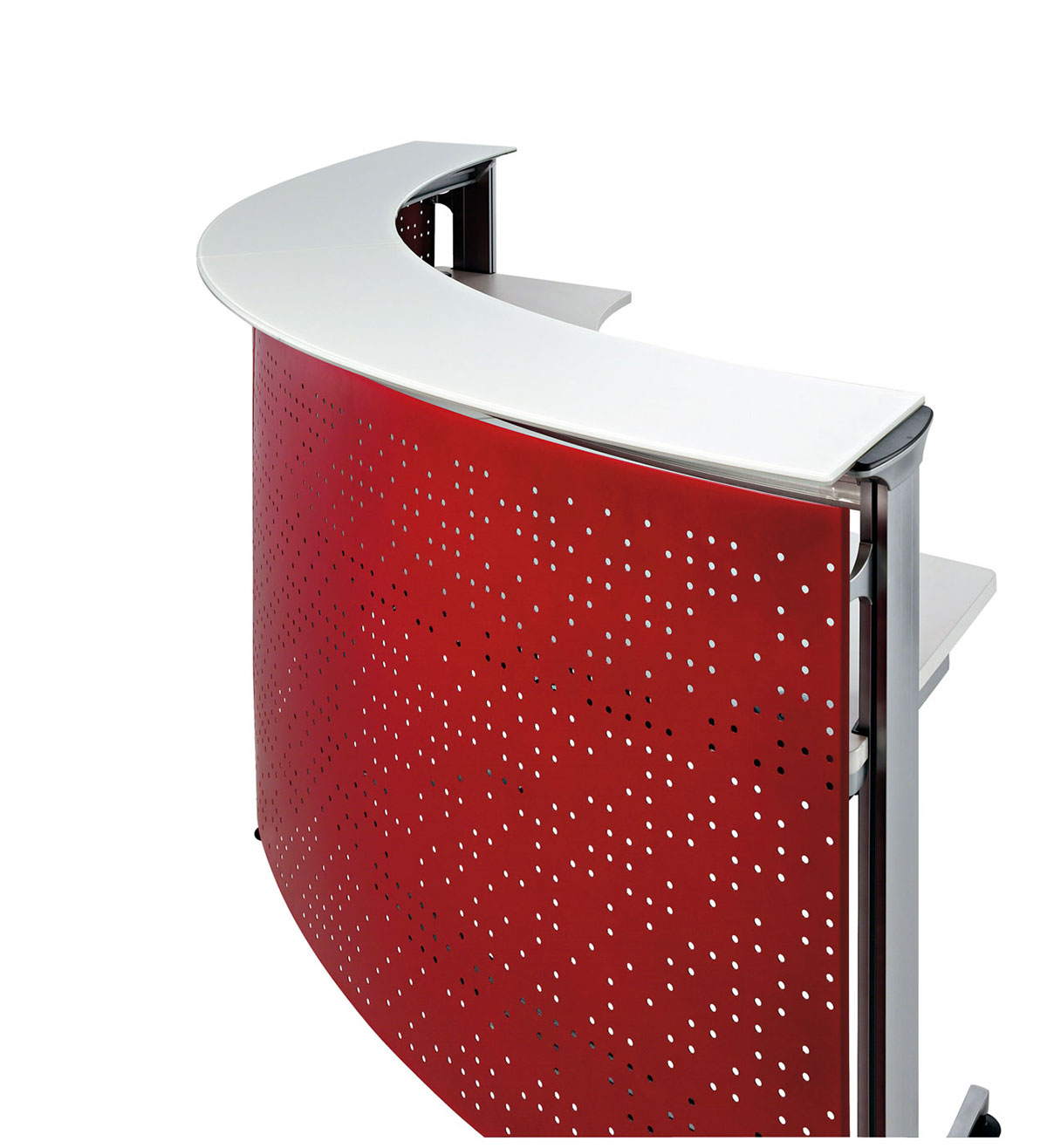 โต๊ะประชาสัมพันธ์ INFORMA มีให้เลือกหลากหลายขนาดและรูปทรง ทั้งครึ่งวงกลม ทรงโค้ง เพื่อตอบสนองความต้องการใช้งานและพื้นที่ทำงานที่แตกต่างกันไป โครงสร้างของโต๊ะเป็นอลูมิเนียมชุบแข็ง วัสดุที่ใช้ทำท็อปโต๊ะมีให้เลือกทั้งไม้เมเปิ้ล และลามิเนตสีขาว หรือกระจก